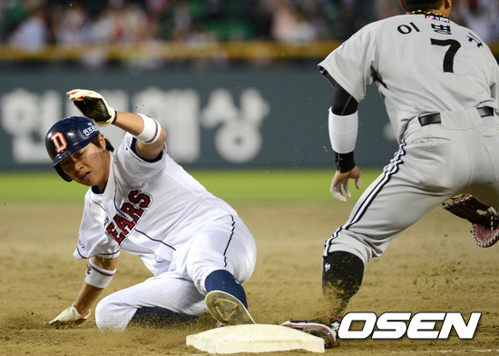 18일 오후 서울 잠실야구장에서 열린 '2012 팔도 프로야구' 두산 베어스와 LG 트윈스의 경기, 4회말 무사 1루 두산 김현수가 외야플라이로 물러나자 1루주자 정수빈이 급히 귀루하고 있다.