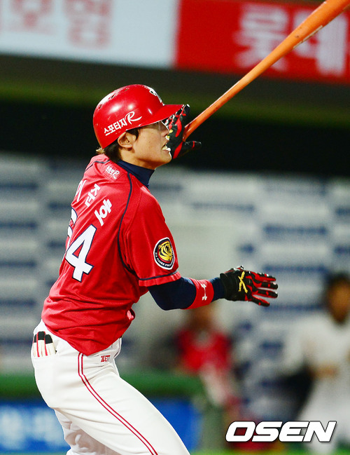 18일 오후 사직구장에서 열린 '2012 팔도 프로야구' 롯데 자이언츠와 KIA 타이거즈 경기에서 5회초 2사 주자 1루 KIA 이준호가 중견수 뒤 1타점 적시타를 날리고 있다.