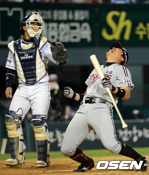 18일 오후 서울 잠실야구장에서 열린 '2012 팔도 프로야구' 두산 베어스와 LG 트윈스의 경기, 5회초 무사 1루 LG 이진영이 삼진으로 물러나며 아쉬워하고 있다.