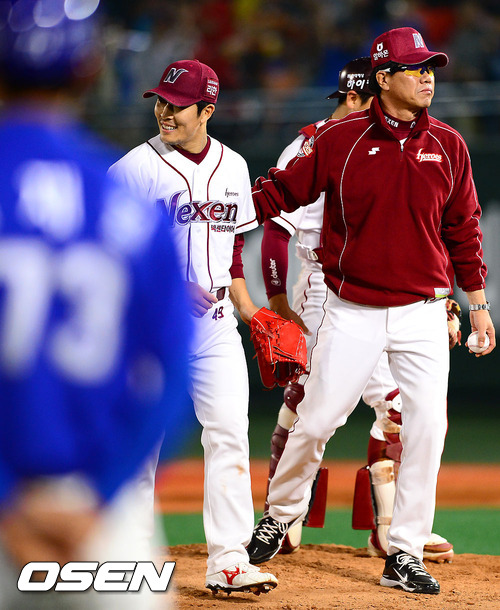 18일 오후 서울 목동구장에서 열린 2012 팔도 프로야구 넥센 히어로즈와 삼성 라이온즈의 경기 5회초 2사 2루 삼성 박석민의 타석때 넥센 김시진이 마운드에 올라와 선발투수 김병현을 교체하고 있다