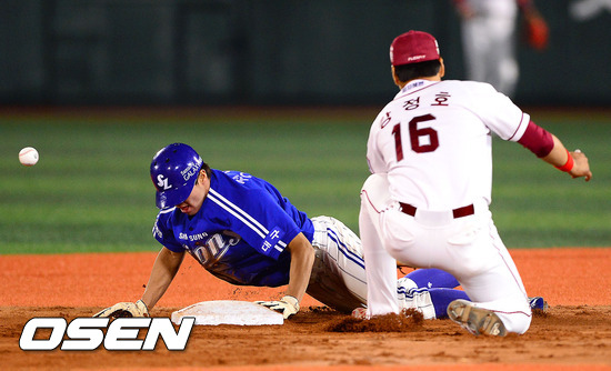 18일 오후 서울 목동구장에서 열린 2012 팔도 프로야구 넥센 히어로즈와 삼성 라이온즈의 경기 5회초 무사 1루 삼성 이승엽의 타석때 1루 주자 정혀식이 도루 성공하고 있다