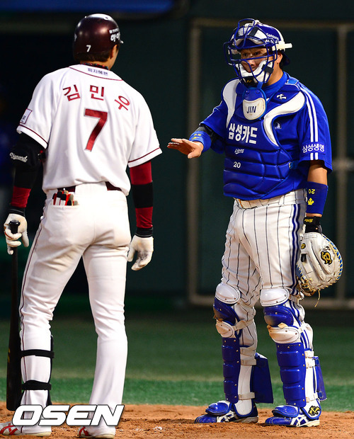 18일 오후 서울 목동구장에서 열린 2012 팔도 프로야구 넥센 히어로즈와 삼성 라이온즈의 경기 3회말 2,3루 넥센 김민우가 삼성 배영수의 투구를 피했다. 진갑용이 김민우에게 스트라이크존에 너무 붙었다고 말하고 있다