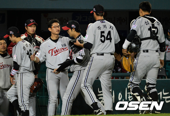 18일 오후 서울 잠실야구장에서 열린 '2012 팔도 프로야구' 두산 베어스와 LG 트윈스의 경기, 7회말 2사 3루 LG 주키치가 두산 최재훈을 삼진으로 처리하고 더그아웃에서 동료들의 축하를 받고 있다.