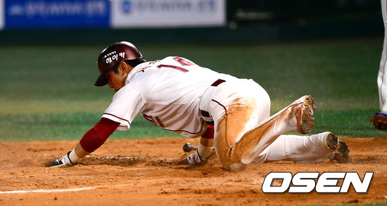 18일 오후 서울 목동구장에서 열린 2012 팔도 프로야구 넥센 히어로즈와 삼성 라이온즈의 경기 6회말 2사 1,2루 넥센 장기영의 1타점 적시타때 2루 주자 서건창이 삼성 진갑용의 태그를 피해 득점을 올리고 있다.