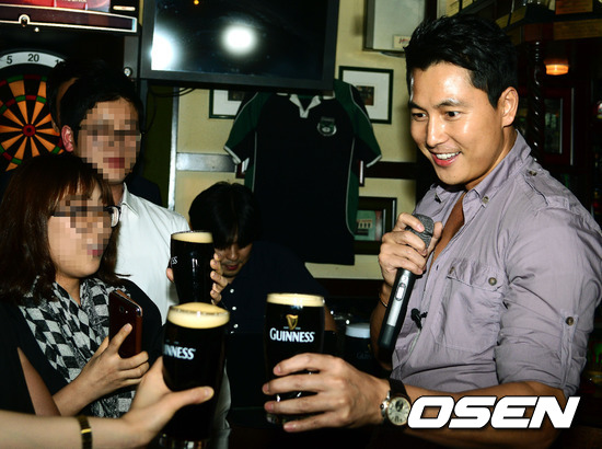 18일 오후 이태원 일대 '베이비 기네스'등 총 3곳에서 배우 정우성이 예고없이 깜짝 등장해서 현장에 있던 모든 사람들에게 맥주를 한잔씩 돌리는 깜짝 이벤트에서 정우성이  맥주를 마신 뒤 맛을 음미하고 있다.