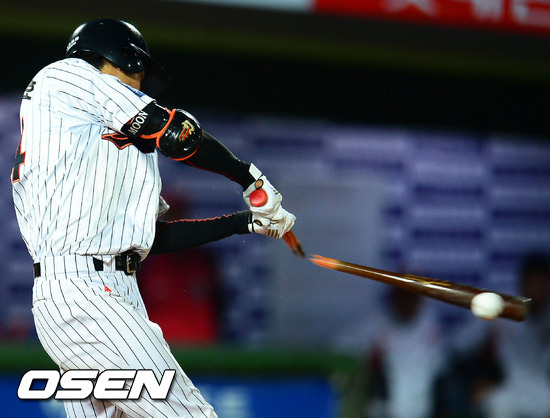 18일 오후 사직구장에서 열린 '2012 팔도 프로야구' 롯데 자이언츠와 KIA 타이거즈 경기 8회말 1사 주자 2루 롯데 김문호가 타석에서 투수 앞 땅볼을 치며 배트가 박살나고 있다.