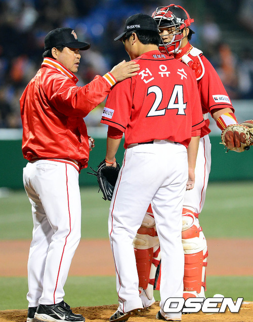 18일 오후 대전 한밭야구장에서 열린 '2012 팔도 프로야구' 한화 이글스와 SK 와이번스의 경기 7회말 2사 1루 이만수 감독이 마운드에 올라가 전유수를 교체시키고 있다.