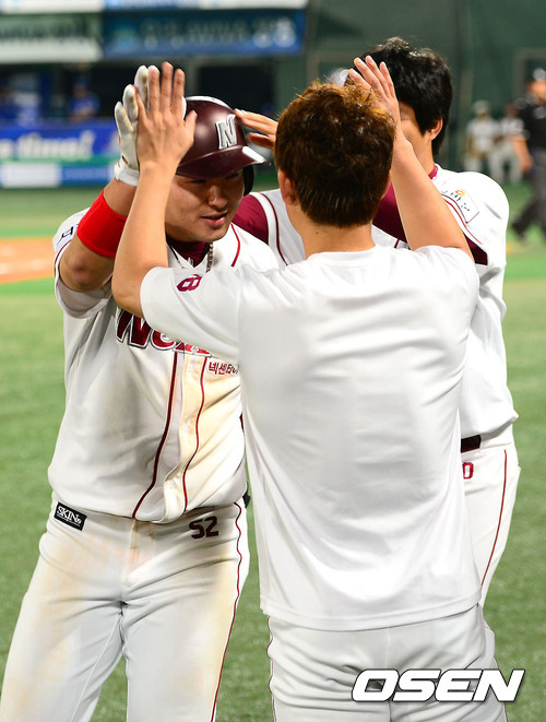 18일 오후 서울 목동구장에서 열린 2012 팔도 프로야구 넥센 히어로즈와 삼성 라이온즈의 경기 7회말 넥센 선두타자 박병호가 솔로홈런을 날리고 동료들의 축하를 받고 있다