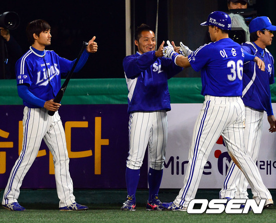 18일 오후 서울 목동구장에서 열린 2012 팔도 프로야구 넥센 히어로즈와 삼성 라이온즈의 경기 8회초 1사 삼성 이승엽이 솔로홈런을 날리고 동료들과 하이파이브를 하고 있다. 시즌 7호 홈런.