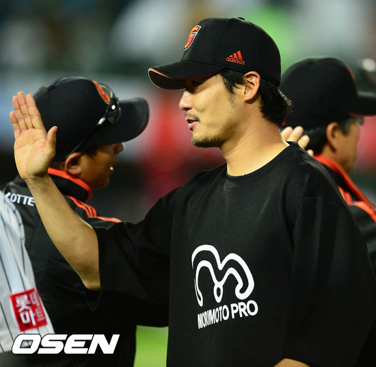 경기를 마치고 롯데 승리투수 이용훈이 코치들과 하이파이브를 하고 있다. / rumi@osen.co.kr