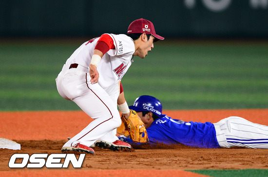 18일 오후 서울 목동구장에서 열린 2012 팔도 프로야구 넥센 히어로즈와 삼성 라이온즈의 경기 8회초 2사 1루 삼성 박석민의 타석때 넥센 서건창 2루수가 1루 주자 강명구의 도루를 태그시도하고 있다. 1루 주자 강명구는 세이프.