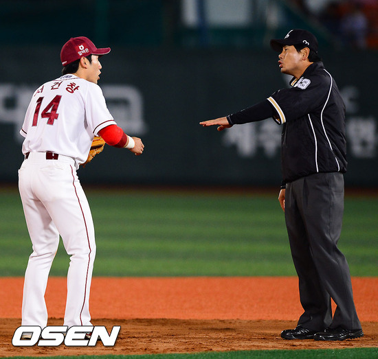 18일 오후 서울 목동구장에서 열린 2012 팔도 프로야구 넥센 히어로즈와 삼성 라이온즈의 경기 8회초 2사 1루 삼성 박석민의 타석때 1루 주자 강명구가 도루 성공했다. 서건창 2루수가 판정에 항의하고 있다.