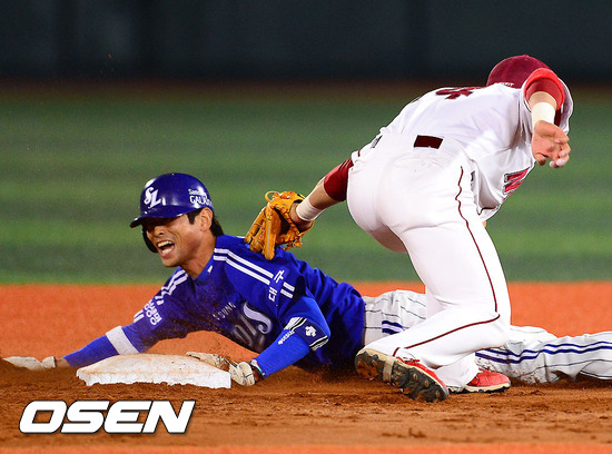 18일 오후 서울 목동구장에서 열린 2012 팔도 프로야구 넥센 히어로즈와 삼성 라이온즈의 경기 8회초 2사 1루 삼성 박석민의 타석때 1루 주자 강명구가 도루 성공하고 있다.