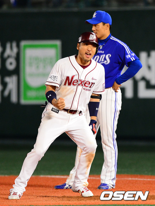 18일 오후 서울 목동구장에서 열린 2012 팔도 프로야구 넥센 히어로즈와 삼성 라이온즈의 경기 8회말 2사 3루 넥센 이택근이 역전 1타점 적시타를 날리고 환호하고 있다.