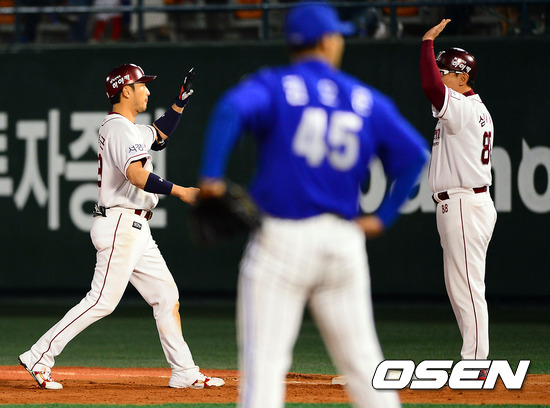 18일 오후 서울 목동구장에서 열린 2012 팔도 프로야구 넥센 히어로즈와 삼성 라이온즈의 경기 8회말 2사 3루 넥센 이택근이 역전 1타점 적시타를 날리고 심재학 코치와 하이파이브를 하고 있다.