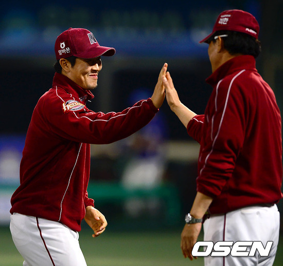 경기종료 후 넥센 김병현이 김시진 감독과 하이파이브를 하고 있다/ soul1014@osen.co.kr