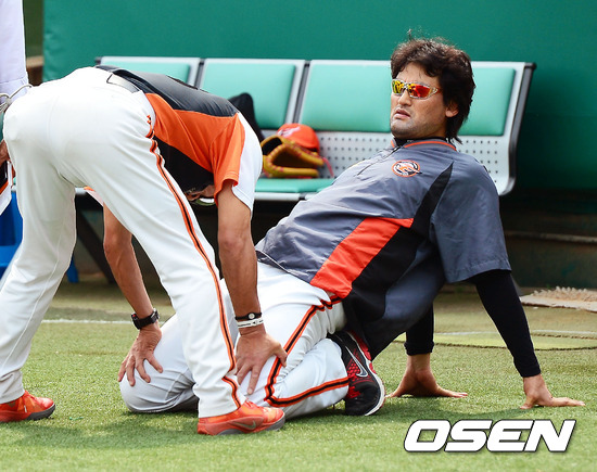 19일 오후 대전 한밭야구장에서 '2012 팔도 프로야구' 한화 이글스와 SK 와이번스의 경기가 열릴 예정인 가운데 양팀 훈련시간에 한화 박찬호가 하나마스 코치에게 스트레칭을 받고 있다.