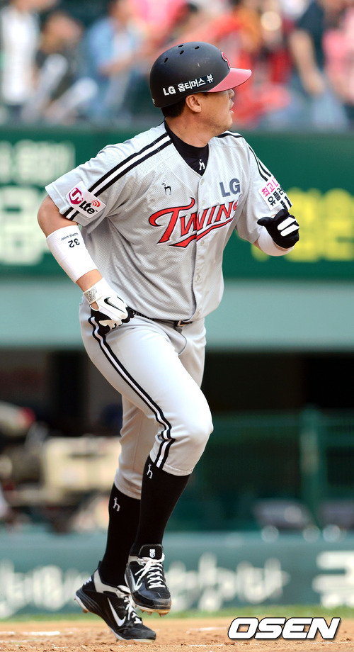19일 오후 서울 잠실야구장에서 열린 '2012 팔도 프로야구' 두산 베어스와 LG 트윈스의 경기 3회초 2사 1,2루 LG 최동수가 3점 홈런을 치고 타구를 바라보고 있다.
