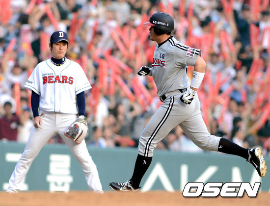 19일 오후 서울 잠실야구장에서 열린 '2012 팔도 프로야구' 두산 베어스와 LG 트윈스의 경기 3회초 2사 1,2루 LG 최동수가 3점 홈런을 치고 베이스를 돌고 있다.