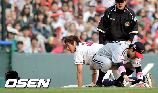 19일 오후 서울 잠실야구장에서 열린 '2012 팔도 프로야구' 두산 베어스와 LG 트윈스의 경기 1회말 2사 두산 정수빈이 3루 도루에 성공하고 있다.