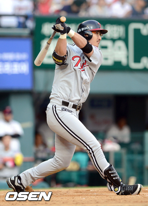19일 오후 서울 잠실야구장에서 열린 '2012 팔도 프로야구' 두산 베어스와 LG 트윈스의 경기 5회초 1사 LG 박용택이 솔로 홈런을 치고 있다.