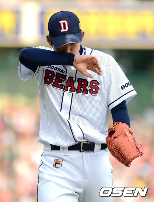 19일 오후 서울 잠실야구장에서 열린 '2012 팔도 프로야구' 두산 베어스와 LG 트윈스의 경기 5회초 1사 두산 정대현이 강판된 후 덕아웃으로 걸어 들어오고 있다.