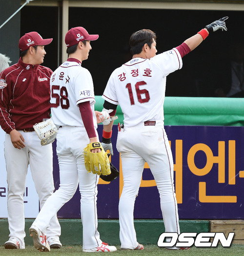 19일 오후 서울 목동구장에서 열린 2012 팔도 프로야구 넥센 히어로즈와 삼성 라이온즈의 경기 4회말 2사 강정호 13호 홈런을 날리고 외야에 위치한 김병현 투수를 향해 손짓을 하고 있다.