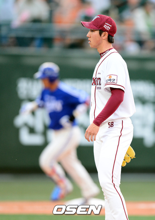 19일 오후 서울 목동구장에서 열린 2012 팔도 프로야구 넥센 히어로즈와 삼성 라이온즈의 경기 5회초 1사 1루 넥센 선발 강윤구가 강봉규에게 투런 홈런을 허용하며 아쉬워하고 있다.