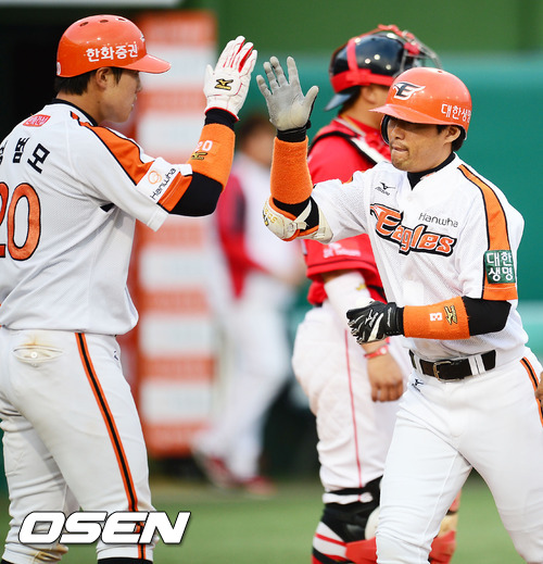 19일 오후 대전 한밭야구장에서 열린 '2012 팔도 프로야구' 한화 이글스와 SK 와이번스의 경기에서 5회말 무사 주자 1루 한화 강동우가 우월 투런홈런을 날린 후 홈에서 선행주자 정범모와 하이파이브를 하고 있다.