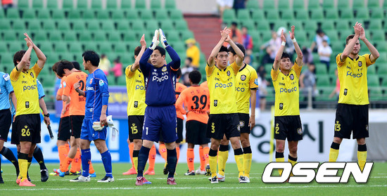 19일 오후 전남 광양 축구전용구장에서 열린 '현대오일뱅크 K리그 2012' 전남 드래곤즈와 제주 유나이티드의 경기 종료후 전남 선수들이 팬들을 향해 박수를 보내고 있다.