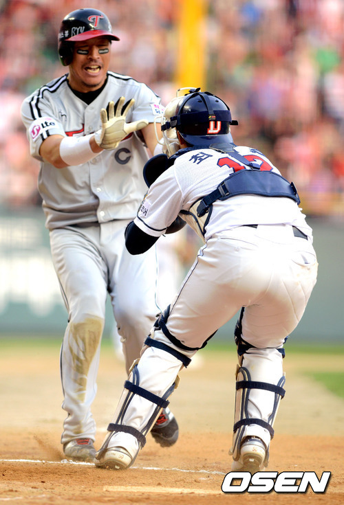 19일 오후 서울 잠실야구장에서 열린 '2012 팔도 프로야구' 두산 베어스와 LG 트윈스의 경기 6회초 2사 1,2루 LG 김태군이 좌전 안타를 치자 2루 주자 LG 이병규가 홈으로 쇄도하다 태그아웃 당하고 있다.