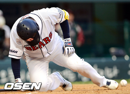 19일 오후 서울 잠실야구장에서 열린 '2012 팔도 프로야구' 두산 베어스와 LG 트윈스의 경기 7회말 무사 두산 이원석이 LG 김기표가 던진 공에 다리를 맞아 고통스러워하고 있다.