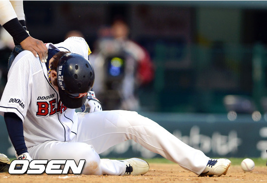 19일 오후 서울 잠실야구장에서 열린 '2012 팔도 프로야구' 두산 베어스와 LG 트윈스의 경기 7회말 무사 두산 이원석이 LG 김기표가 던진 공에 다리를 맞아 고통스러워하고 있다.