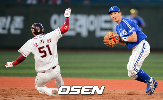 19일 오후 서울 목동구장에서 열린 2012 팔도 프로야구 넥센 히어로즈와 삼성 라이온즈의 경기 7회말 무사 1루 이태근 내야땅볼때 1루 주자 장기영 2루에서 포스아웃되고 있다.