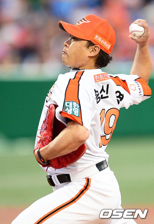 19일 오후 대전 한밭야구장에서 열린 '2012 팔도 프로야구' 한화 이글스와 SK 와이번스의 경기에서 7회초 마운드에 오른 한화 송신영이 힘차게 공을 뿌리고 있다.