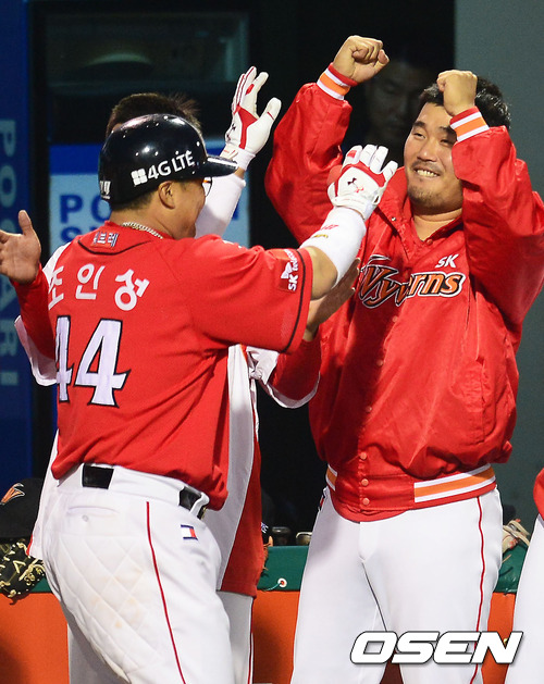 19일 오후 대전 한밭야구장에서 열린 '2012 팔도 프로야구' 한화 이글스와 SK 와이번스의 경기에서 8회초 1사 주자 1,2루 SK 조인성이 좌월 스리런 홈런을 날린 후 덕아웃에서 이호준과 기쁨을 나누고 있다.