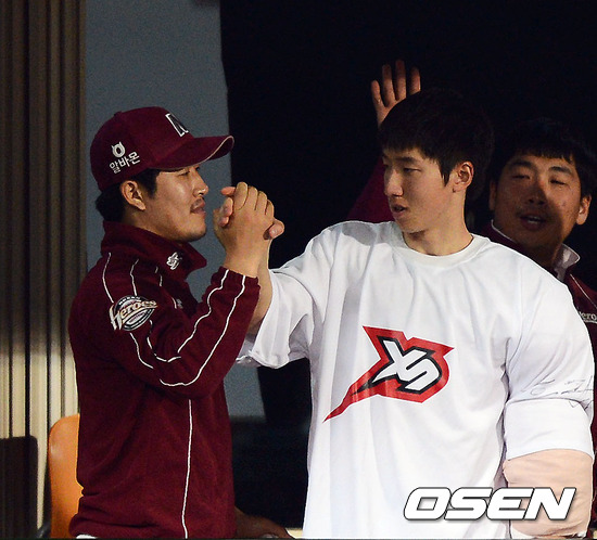 경기 종료후 김병현이 첫승을 올린 선발 강윤구와 승리의 기쁨을 나누고 있다./ ajyoung@osen.co.kr