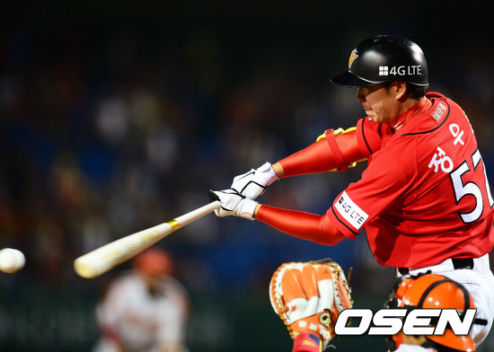 9회초 무사 주자 1루 SK 대타로 투수 정우람이 타석에 올라 투수 앞 병살타를 치고 있다. / rumi@osen.co.kr