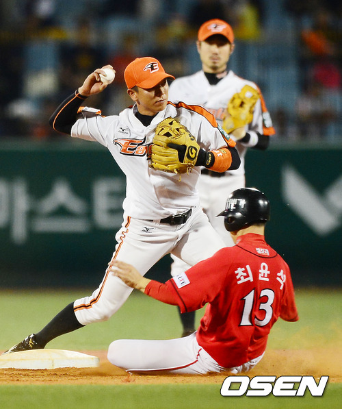 9회초 무사 주자 1루 SK 대타로 투수 정우람이 타석에 올라 투수 앞 타구가 병살타로 연결되며 2루에서 최윤석이 포스아웃 당하고 있다. / rumi@osen.co.kr