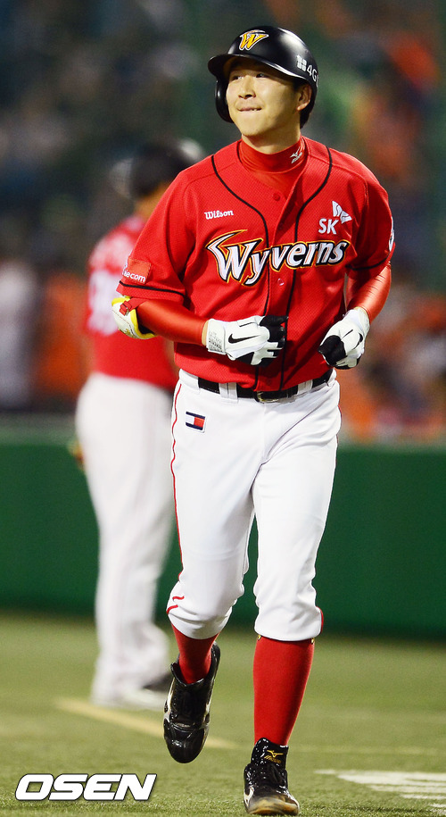 9회초 무사 주자 1루 SK 대타로 투수 정우람이 타석에 올라 투수 앞 병살타를 친 후 덕아웃으로 향하고 있다. / rumi@osen.co.kr