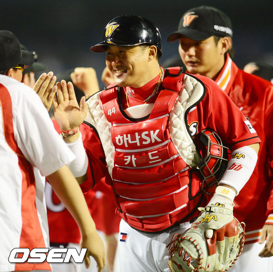 경기를 마치고 SK 조인성이 코치들과 하이파이브를 하고 있다. / rumi@osen.co.kr