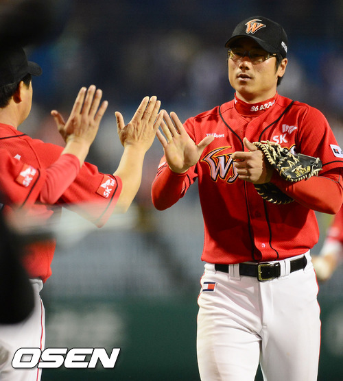 경기를 마치고 SK 박정권이 이만수 감독과 하이파이브를 하고 있다 / rumi@osen.co.kr
