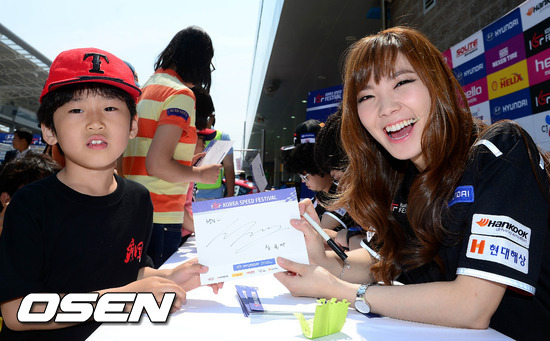 20일 오전 전남 영암 코리아 인터내셔널 서킷에서 열린 '2012 헬로모바일 슈퍼레이스 챔피언십 시리즈'에서 신보라가 한 어린이와 기념촬영을 갖고 있다.