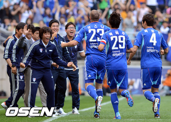 20일 오후 수원월드컵경기장에서 열린 '현대오일뱅크 K리그 2012' 수원 삼성과 울산 현대의 경기 전반 수원 보스나가 동점골을 넣고 벤치에서 코치들과 기뻐하고 있다.