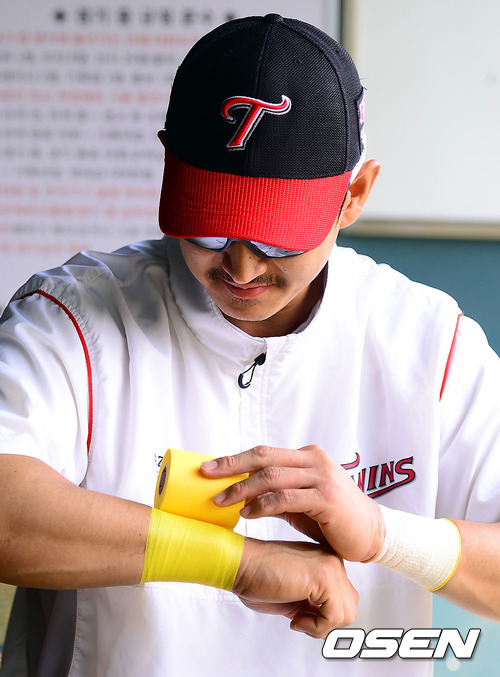 20일 오후 서울 잠실구장에서 열리는 2012 팔도 프로야구 두산 베어스와 LG 트윈스의 경기 전 LG 박용택이 손목에 테이핑을 하고 있다.
