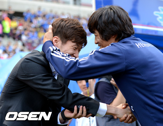 20일 오후 수원월드컵경기장에서 열린 '현대오일뱅크 K리그 2012' 수원 삼성과 울산 현대의 경기전 수원월드컵 경기장을 찾은 박지성이 수원 서정원 코치와 이야기를 나누고 있다.