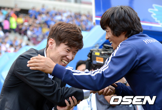 20일 오후 수원월드컵경기장에서 열린 '현대오일뱅크 K리그 2012' 수원 삼성과 울산 현대의 경기전 수원월드컵경기장을 찾은 박지성이 수원 서정원 코치와 이야기를 나누고 있다.