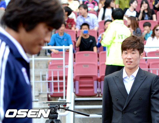 20일 오후 수원월드컵경기장에서 열린 '현대오일뱅크 K리그 2012' 수원 삼성과 울산 현대의 경기전 수원월드컵경기장을 찾은 박지성이 그라운드에 내려와 서정원 코치에게 인사를 하고 있다.