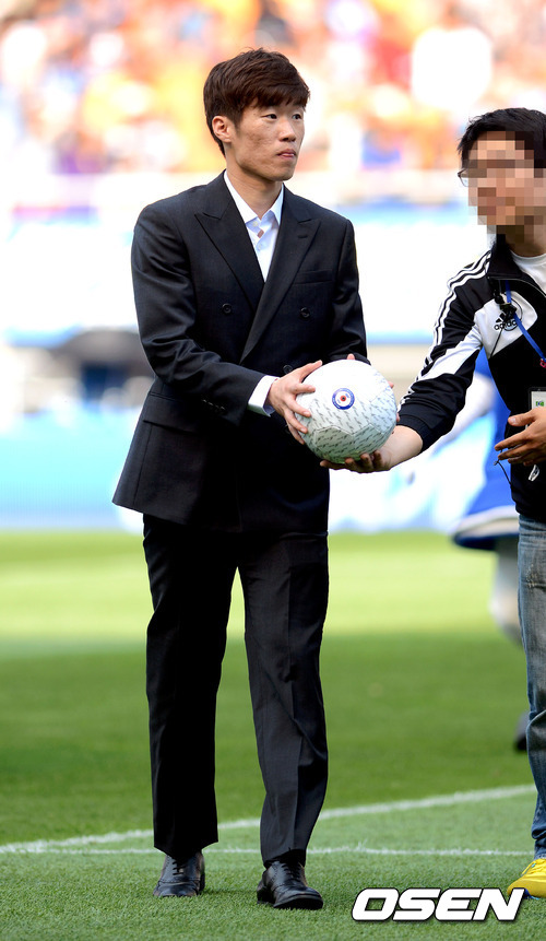 20일 오후 수원월드컵경기장에서 열린 '현대오일뱅크 K리그 2012' 수원 삼성과 울산 현대의 경기 하프타임 시간에 박지성이 그라운드를 돌며 팬들에게 사인볼을 나눠주고 있다.