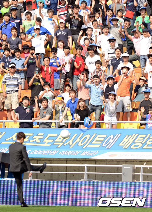 20일 오후 수원월드컵경기장에서 열린 '현대오일뱅크 K리그 2012' 수원 삼성과 울산 현대의 경기 하프타임 시간에 박지성이 그라운드를 돌려 팬들에게 사인볼을 차주고 있다.
